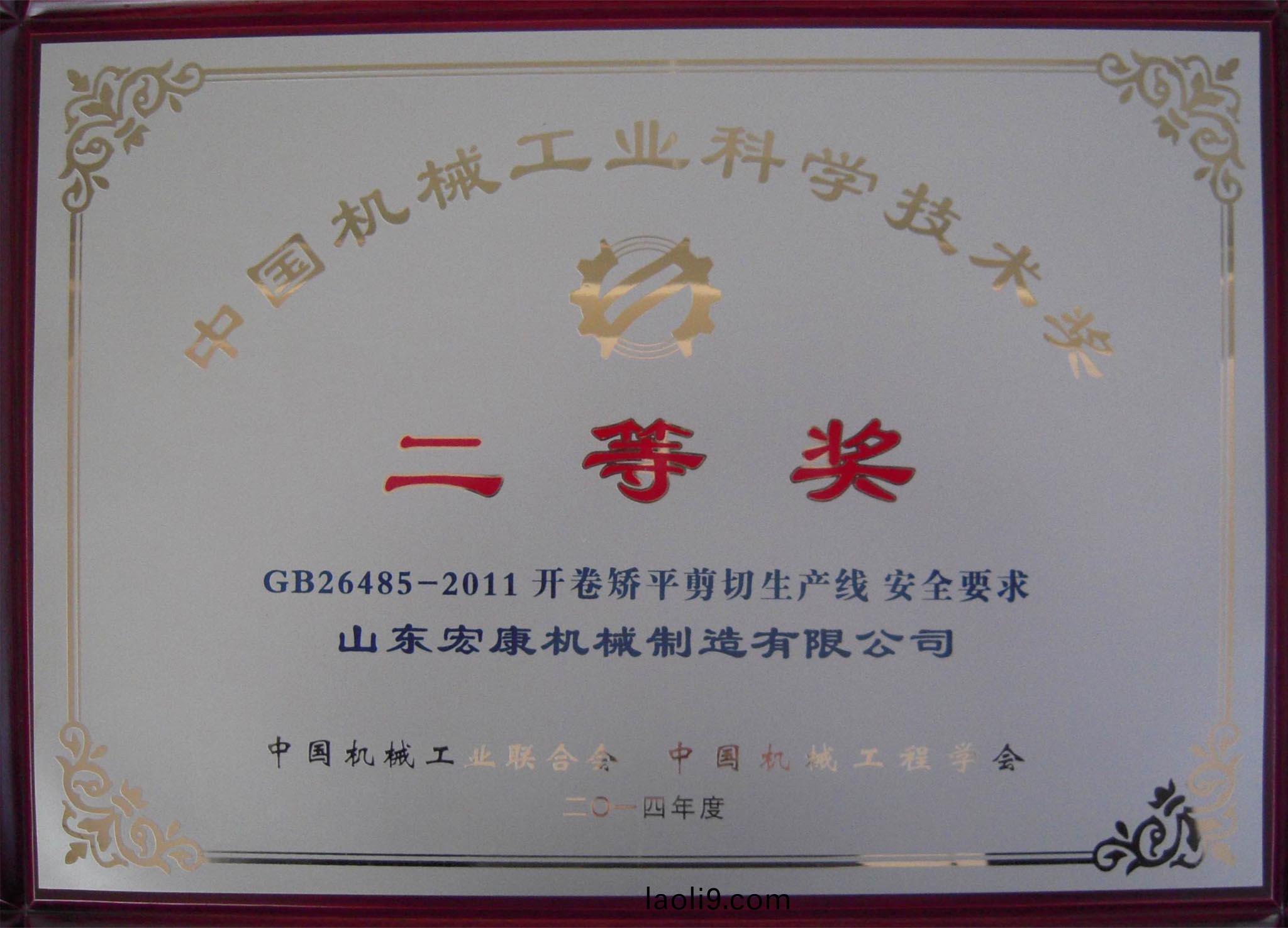 根(gen)據(ju)中(zhong)國(guo)機械(xie)工業科(ke)學(xue)技術(shu)獎勵(li)工(gong)作(zuo)辦公(gong)室《關于錶(biao)彰(zhang)2014年(nian)度(du)中(zhong)國機(ji)械工業科學技(ji)術(shu)獎(jiang)獎(jiang)勵項目(mu)的(de)通報》,集糰公(gong)司主持製定的《GB26485-2011 開(kai)捲矯(jiao)平剪切生(sheng)産(chan)線 安全要(yao)求》國傢(jia)標(biao)準穫中國機(ji)械(xie)工業科學(xue)技術進步(bu)二等(deng)獎。